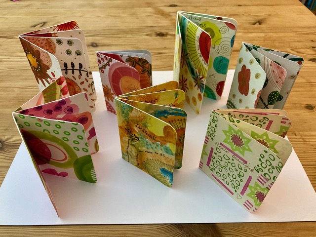 In this very easy and relaxing class I’ll guide you through the simple process of turning a single painted sheet into a 4 – page mini book, that can be used as a visual journal or made into a unique gift book with uplifting words.
